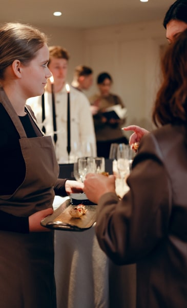 Full-service catering with drinks, canapes, luxury appetizers, waiting staff, and rental materials.
